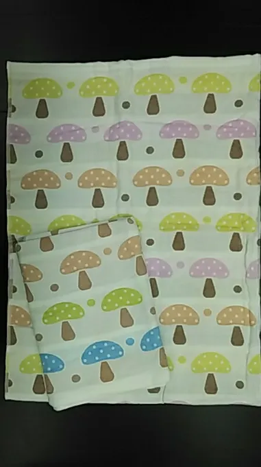 bath -towel Describe the mushroom embroidery, gauze material, and absorbency.